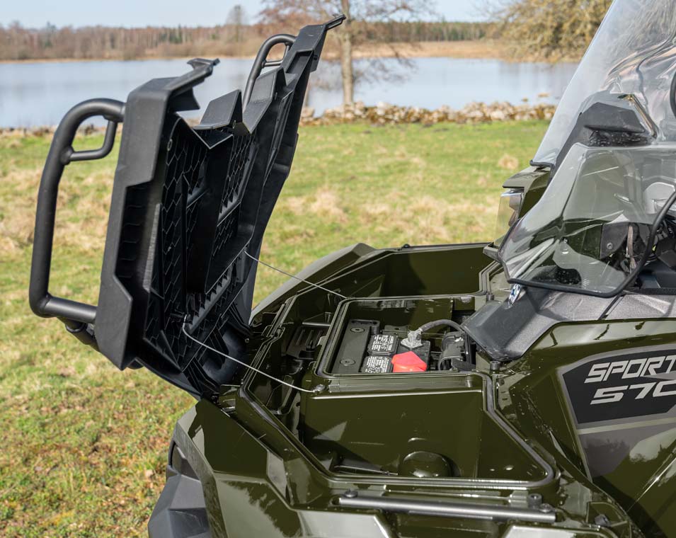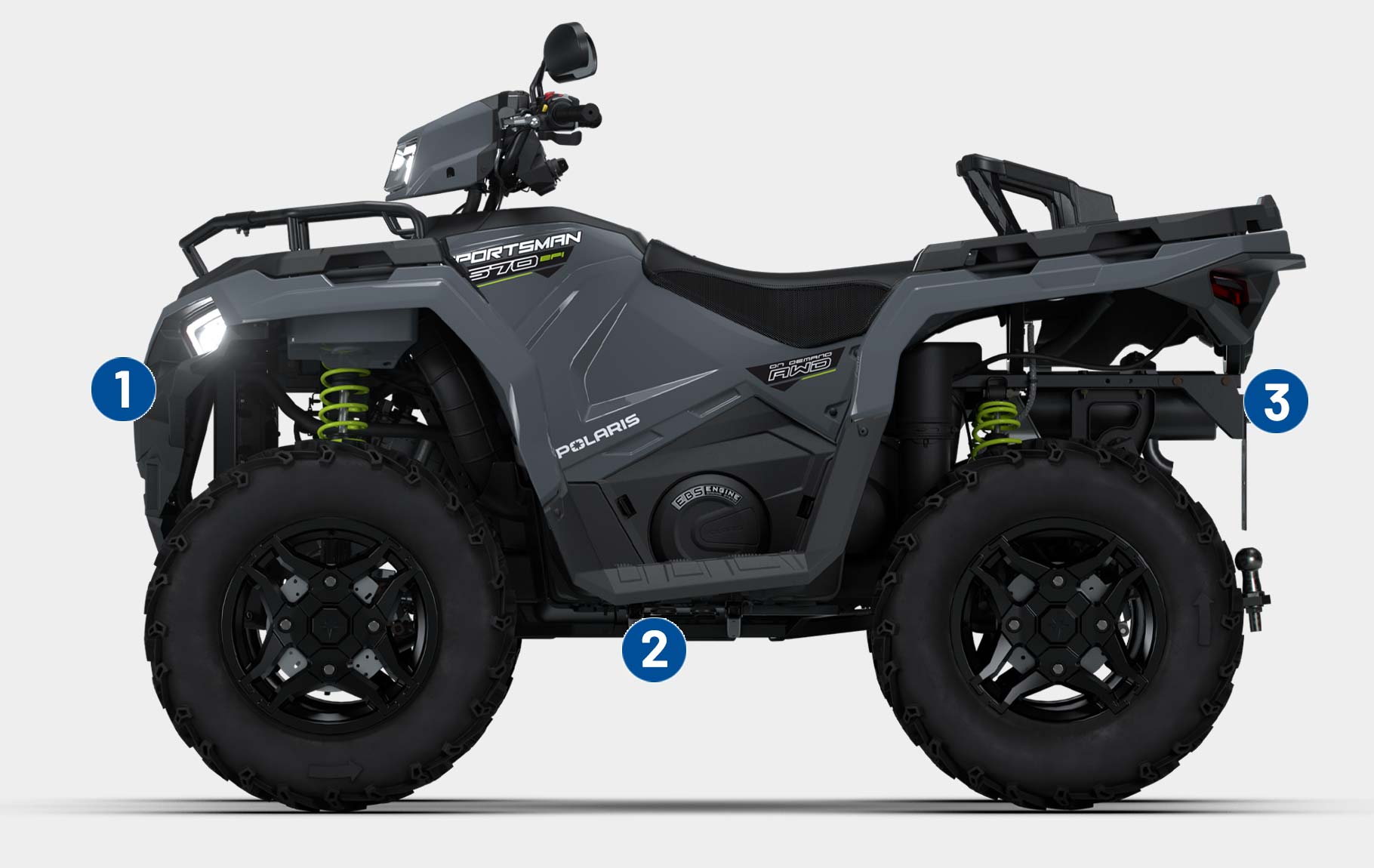 - 12-Volt-Steckdose, Ladeanschluss im Pod, PIN-aktiviertes Sicherheitssystem (P.A.S.S.), Frontgepäckträger-Erweiterung, Windenhalterung enthalten