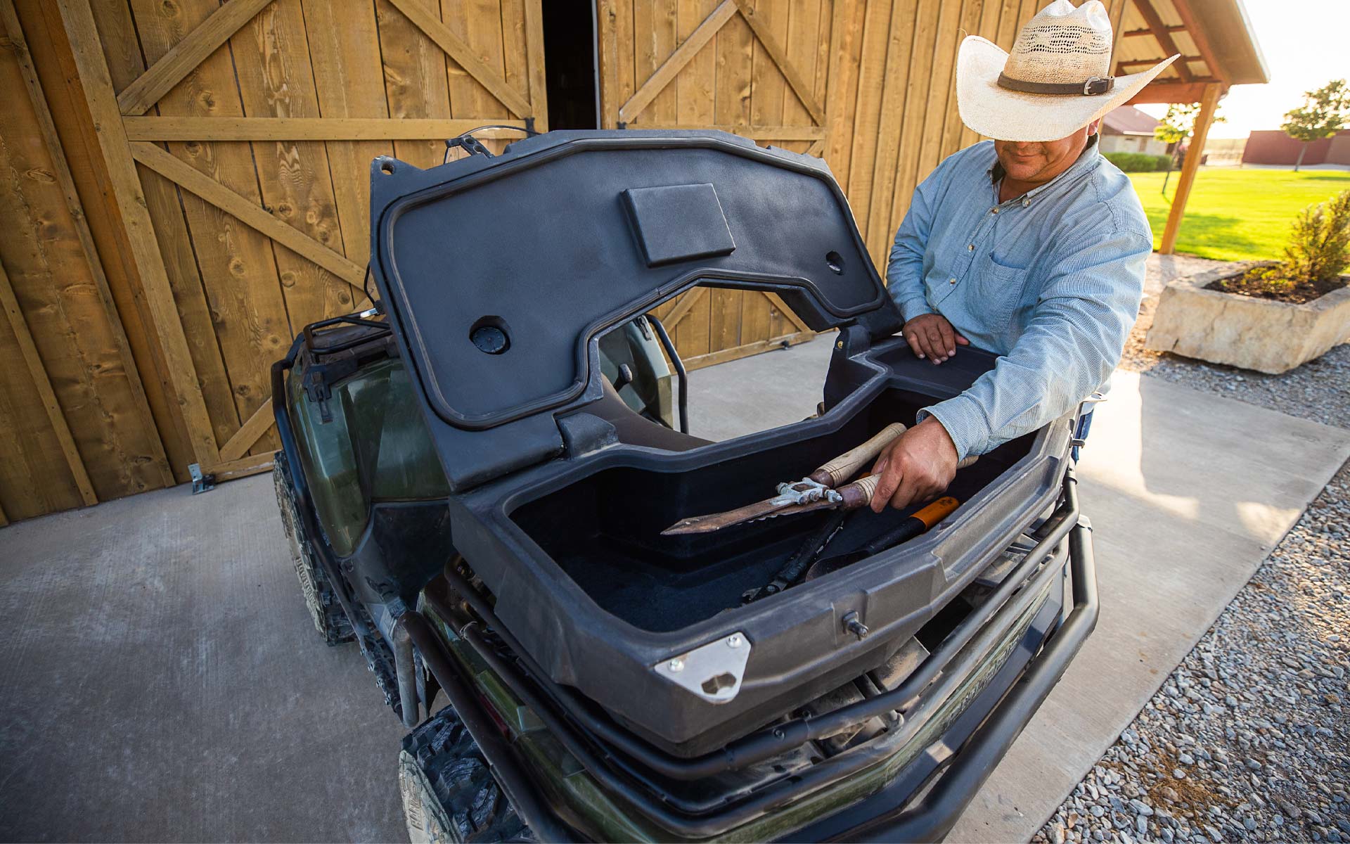 - 12-Volt-Steckdose, Ladeanschluss im Pod, PIN-aktiviertes Sicherheitssystem (P.A.S.S.), Front- und Heckgepäckträger-Erweiterung, Windenhalterung enthalten, 1.588-kg-Winde mit Stahlseil